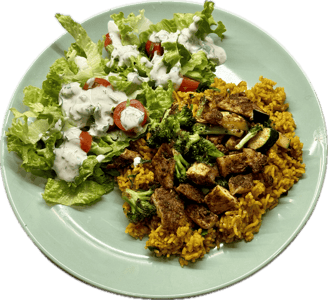 Serve finished rice topped with chicken and veggies and combine with a side salad of chopped cherry tomatoes and green leaf lettuce. Drizzle with white sauce and your favorite hot sauce, if desired.