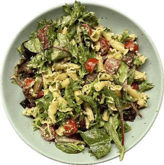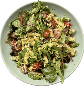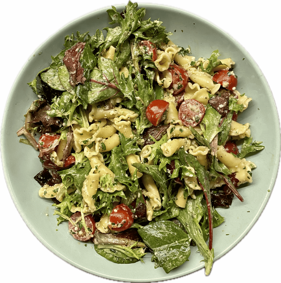 Introducing a vibrant and satisfying salad that blends fresh and hearty ingredients! This dish features a crisp base of spring mix, sweet bursts from sliced cherry tomatoes, and the sharp nuttiness of shaved Parmesan. Adding cooked Campanelle pasta gives it a satisfying, chewy, and dynamic texture. Tossed in a creamy avocado citrus dressing, the salad has a refreshing zest with the richness of ripe avocado balanced by a hint of bright lemon and lime. Perfect as a light lunch or a side dish, this salad is a delightful fusion of textures and flavors that will leave you craving seconds—and maybe thirds.