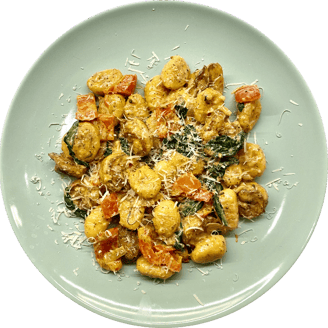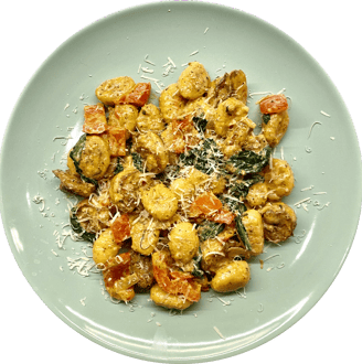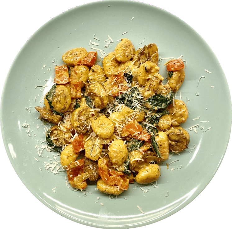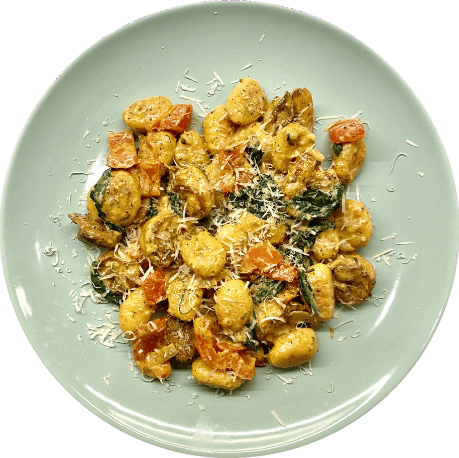 However, gnocchi is technically not a form of pasta. It’s actually a dumpling made out of potatoes. That said, it works mighty well with a variety of pasta sauces and toppings. This meal not only comes together quickly, it’s a single-pan situation that builds on each flavor as you cook it. I first got acquainted with gnocchi in college, often boiled and pan-seared with pine nuts and broccoli. This dish is more of a take on Rasta Pasta—a super creamy affair traditionally tossed with jerk chicken and bell peppers. We’re opting for shrimp here to give it that extra pinch of elegance fit for special occasions or that special someone.