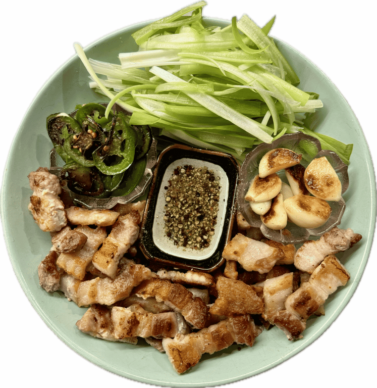 The brisket, sirloin, marinated shrimp, octopus and chicken are all must-trys in the protein lineup, as well as the sweet potato, mushroom and pineapple on the plant-based side. This is all cooked yourself of course on the tabletop grill. But the king of KBBQ is the pork belly. This recipe pairs the royal highness with grilled jalapeños and garlic—seared until golden brown and softened both in terms of texture and flavor. Co-starring in this meal are a bed of delicate, julienned scallion and the breakout sensation that is gireumjang—which translates to "oil sauce" or "oil condiment". This Korean sesame oil dipping sauce, made with a generous amount of salt and pepper, is a commonality in Korean barbecue—especially with pork belly. It will quite literally change your life.
